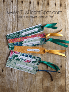 Yesterdays post included cute packaging using retired Designer Series Paper. Today’s post is using those scraps… Below is that picture… Again using scraps, I covered the backs of the strips with Whisper White Card stock by adhering with Tombow glue. I used the delightful tag topper punch for the top and tied ribbon through the holes. Voila! The bookmarks seemed a bit plain and I wanted a simple saying, so went to the computer and printed out sayings on Whisper White card stock. After cutting them down to size and using the classic label punch, I punched the ends doing one at a time as the words are longer than the punch. Again, these are just for passing out to a book group of friends or for using yourself. Enjoy!