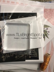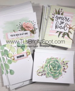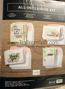 Then… I worked on this fun card kit – Notes of Kindness. It comes complete with an acrylic block, a Stampin’ Spot, dimensionals, glue dots and supplies to make 20 – get that 20 cards to put together – oh and did I say directions too?. Love, love, love the soft pink and green together. Here’s what it looks like before opening the pkg and putting the cards together.