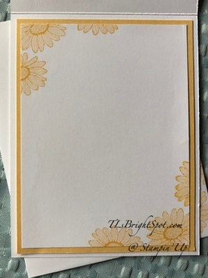 Card #1 uses the Wreath Builder Dies and Small Bloom Punch, also Flowers For Every Season 6×6 DSP. The ribbon is the 1/4″ Gingham in Bumblebee. I added the sweet flower centers from the 20-22 In Color Enamel Dots. Blossoms in Bloom stamp set offered the sentiment “Thinking of You” and Timeless Tulips was used for the sentiment in the circle. Daisy Lane was used for the inside of the card and front of the envelope.