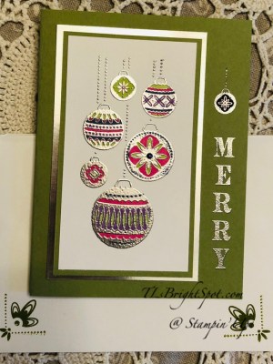 - stamp the ornaments using Versamark ink on Whisper White panel, sprinkle with silver embossing powder then heat emboss to set.