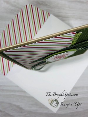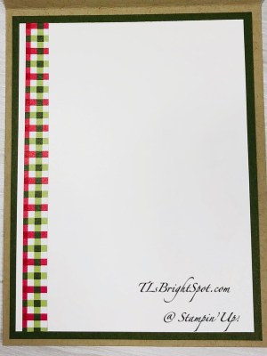 So, so simple but I love how the inside coordinates with the outside… another strip of DSP adhered to Whisper White panel. This was adhered to Mossy Meadow and attached to the Crumb Cake card base. And voila, your card is complete!