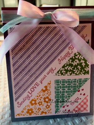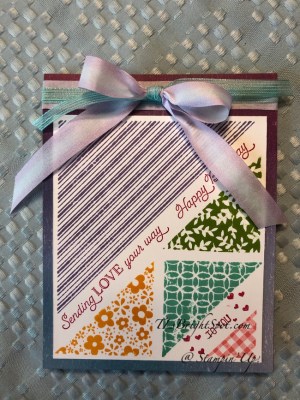 Here are the ink colors I used… Highland Heather, Flirty Flamingo, Coastal Cabana, Mango Melody, Granny Apple Green, and Melon Mambo.. The scripty sentiment is from the Posted For You stamp set and the block ‘TO YOU” is from Hooray To You stamp set.ย They were stamped on a Whisper White panel – and I used my Stamparatus to make sure everything stayed straight. The Whisper White panel was adhered to Artistry Blooms DSP with liquid glue. Then I took ribbons from The Playing with Patterns Ribbon Combo pack and adhered them to the top of the card with Stampin Seal. I created a bow and adhered that with a glue dot.. This then was adhered to a Highland Heather card base with Stampin Seal.