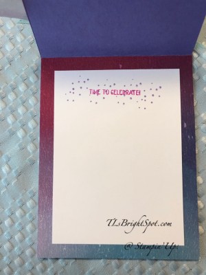 For the inside I took another panel of the Artistry Blooms DSP and adhered it to the card base with liquid glue. I took another panel of Whisper White and stamped the ‘confetti’ in Highland Heather ink and the sentiment in Melon Mambo. Both are from the Hooray to You stamp set. This was adhered to the inside with liquid glue and the card was complete. As I said, not my usual kind of card but it will be perfect for the person it is intended.