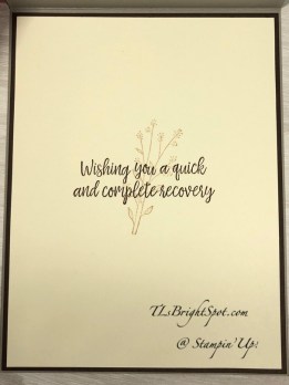 For the inside.. on a panel of Very Vanilla, stamp the leaf/ fall floral bouquet in stamped off once Crumb Cake ink. Over the top of this stamp the sentiment from Healing Hugs stamp set in Early Espresso ink. Adhere the completed Very Vanilla panel to Early Espresso cs with liquid glue then add to the card base the same way. yes – card completed…