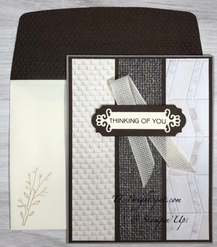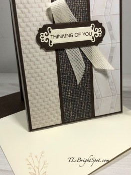 In the last photo I’m hoping you can see that I dry embossed the envelope flap after adhering Early Espresso cs to the flap. I used the Tastful Textile 3D embossing folder. The front of the card got another of those floral/ leaf bouquets. And this card is ready to send! Actually – it went out in yesterday’s mail 😊