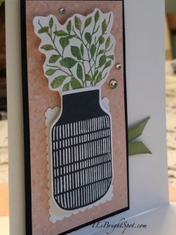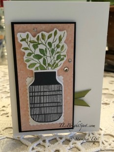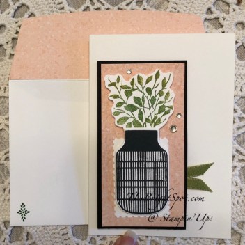 I started by stamping the largest vase stamp from the Boho Indigo stamp set on a Whisper White cs with Memento Black ink and die cutting it with theΒ coordinating dies. I then stamped the leaf grouping using sponge daubers and Garden Green ink and Pear Pizzazz ink. In nature not all leaves are exactly uniform in color, so why should these be – right? Since there is not a die for this stamp, I fussy cut it. I used the Postage Stamp Punch and Whisper White to create a background for the vase, adhering the vase with dimensionals. I used a Petal Pink from the Peony Garden DSP and adhered the Vase/ Postage stamp Punched piece with liquid glue. I put dimensionals on the back of the leaf bunch and added it, making it look as though the leaves were in the vase. This Peony Garden panel was adhered to Basic Black cs with liquid glue. I added a length of folded in half piece of Old Olive 1/4″ Ribbon to the back with Stampin Seal and this entire panel was adhered to the notecard with dimensionals. I added some Rhinestone Basic Jewels and the card front was done.