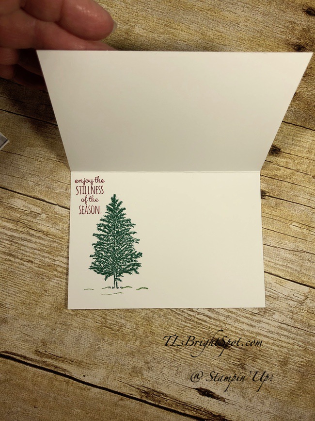 I choose to stamp the larger tree from the Merry Moose stamp set in Shaded Spruce ink and the added grass in Garden Green ink (hard to tell that). The sentiment, also from the Merry Moose stamp set is stamped in Merry Merlot ink. For the envelope, I used the same design from the Plaid Tidings 6×6 DSP and adhered it to the envelope flap. Done, done, done.