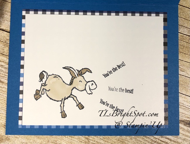 Today’s card features some of the new masculine Well-Suited Designer Series Paper that will be available come Jan 5, 2021 – AND the Darling Donkey stamp set that is a FREE ITEM as part of Sale-a-bration, also beginning Jan 5, 2021. That free item is only when purchasing $50 worth of Stampin’ Up! product – just reminding…