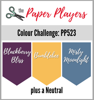Hello again – Monday madness? Try doing something creative and fun… that will get the juices flowing and you feeling less frantic. At least, that’s my theory – and I’m stickin’ to it. 😏 Todays card was inspired by the Paper Players Challenge #523 – use Blackberry Bliss, Bumblebee & Misty Moonlight with a neutral thrown in somewhere. So here’s what I did…