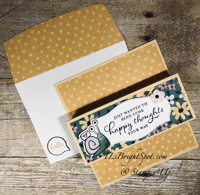 Cover the envelope flap with more of the Flower & Field DSP and stamp the front of the envelope with the word bubble in Memento Black ink and the word in So Saffron. Both come from the Snailed It stamp set. Voila!