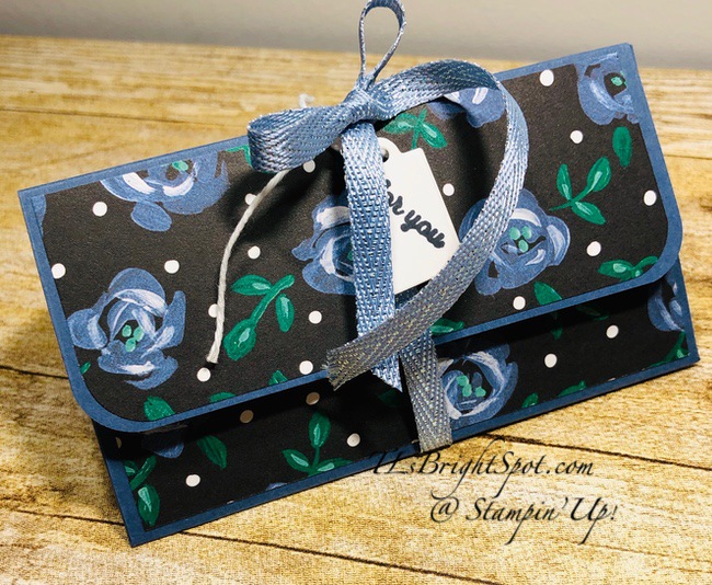 Because this is a giftie, I die cut a small tag using a die from the Hydrangea Dies and stamped the ‘for you’ using the Itty Bitty Greetings stamp set and Tuxedo Black Memento ink. I added the white twine from the Snail Mail Twine Combo Pack to attach it to the ribbon. I used the Seaside Spray Metallic Ribbon to tie around the box to keep it closed. And you could add a glue dot on the bottom of the box to keep the ribbon from getting lost from the box. :O)