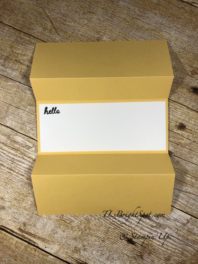 Now turn this over to adhere a Basic White panel in the center to write something special. I did stamp the ‘hello’ from the Snail Mail stamp set in Memento Black ink before attaching it to the card.