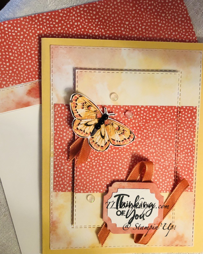 - I also added to Card 2 Terra Cotta Tile ribbon from the Ornate Garden Ribbon Combo Pack: a tiny piece under the tail of the butterfly and the same ribbon back & forth behind the sentiment panel. This sentiment panel has a background from the same Butterfly Bijou 6×6 DSP and is on dimensionals.