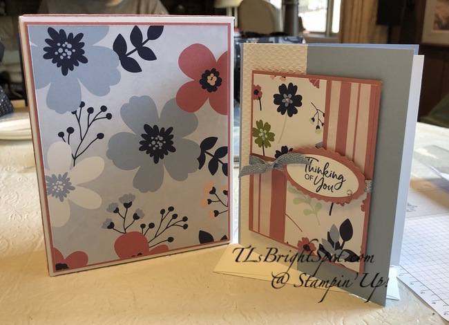 The class made the same box, only with different papers, and a coordinating card – and I want to share them with you. The DSP this time was Paper Blooms DSP, one of the FREE packets of 12 x 12 paper. The focus was to make the box, decorate if there was time, and to make a card. Take a peek…