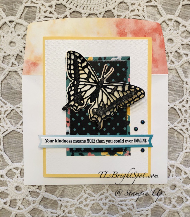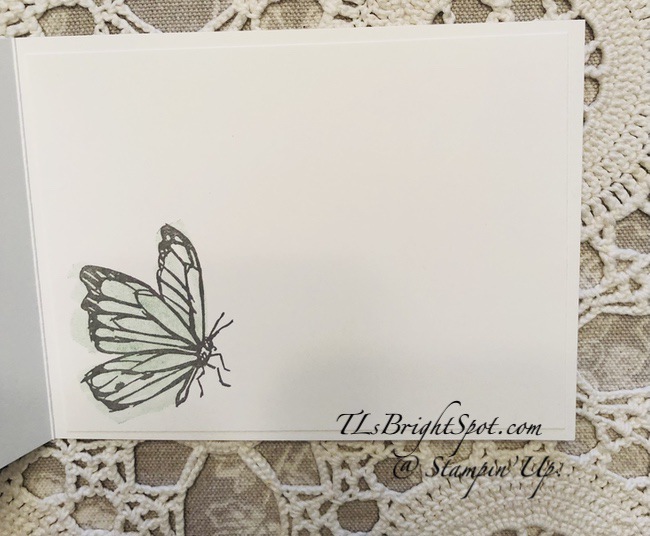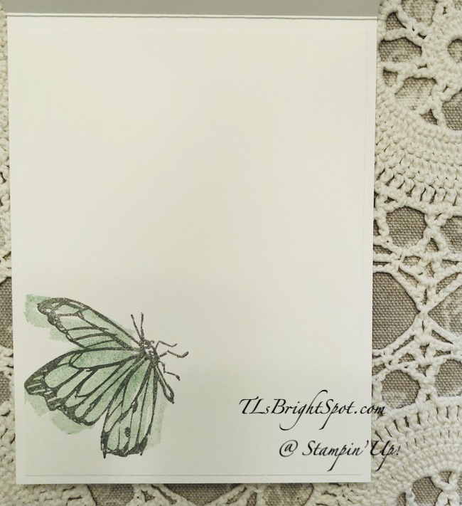 These butterfly ‘tops’ are all ones that were on my desk after playing last week and since the box is a butterfly one, I decided to use them. The blue card butterfly top is die cut from Mint Macaron with the underpart cut from Butterfly Bijou 6×6 DSP. The green card butterfly top is die cut from Just Jade with the underside being the same paper from Butterfly Bijou 6×6 DSP. Both of these were adhered to a panel of Oh So Ombre 6×6 DSP (part of the freebies during Sale-a-bration) with a Vellum Doily atop it. The doily was adhered with Seal + and the butterfly with liquid glue. With the blue card I took a panel of Basic White card stock and ran it through the Old World Paper 3D embossing folder. The blue square panel was adhered with Foam Adhesive cut smaller so it doesn’t show. The thank you sentiment is one die cut using the Many Messages bundle, which cuts several sentiments at once. I adhered it to a slightly larger piece of the same Oh So Ombre 6×6 DSP, put a dimensional under the bottom half and a dab of liquid glue under the half and added it to the card. to finalize the front of the blue card I added 3 Iridescent Pearls.