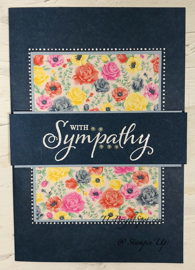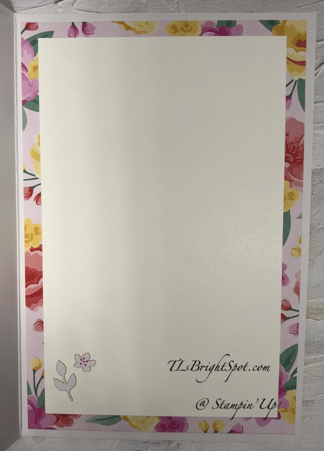 Obviously this is a sympathy card… I added Seaside Spray card stock behind the floral pattern and behind the sentiment panel as well. The sentiment on the card front is from Touched My Heart stamp set. The sentiment is on dimensionals and it has 5 Pearl Basic Jewels added. For the inside I used Flowers For Every Season 6×6 DSP, Basic White card stock and a single sticker from the Flowers For Every Season Memories & More Card Pack.