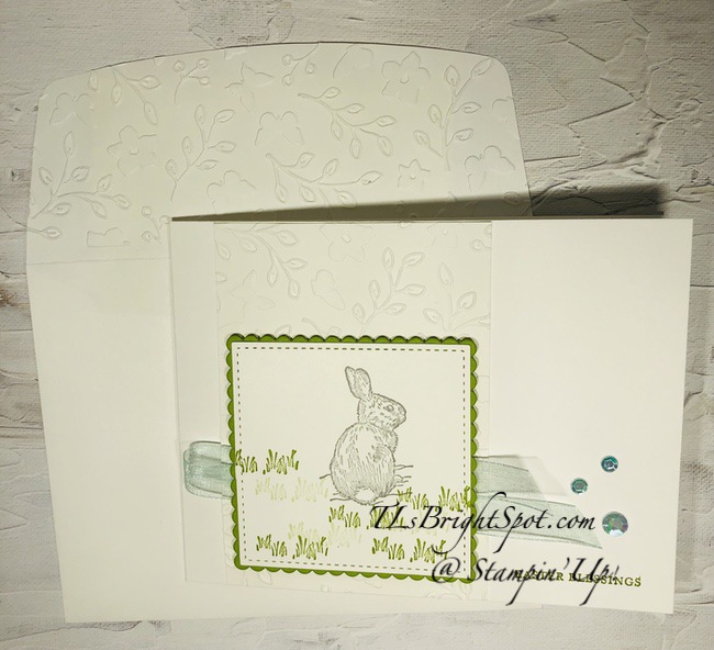 No DSP on this card! I feel as though I should make this again ~ in Very Vanilla, just to see the difference. Maybe I will, but for now it’s Basic White Thick we have for the card base. I stamped the bunny from Nature’s Beauty stamp set in Smoky Slate ink on a Basic White panel, then die cut it with the second largest of the Stitched Squares Dies. I then stamped the grasses from the same stamp set with Soft Sea Foam ink and Granny Apple Green ink. Because of the darker green grass, I die cut a scalloped square using the Layering Squares Dies and Granny Apple Green card stock. I adhered these two together with liquid glue. I then took the Sheer Ribbon in Pool Party and wove it back and forth, adhered it to the back of this panel with Seal+. I took another strip of Basic White card stock and ran it through the Meadow Moments Embossing Folder. (Love this embossing folder!) I adhered this embossed panel to the card front, off-set. I stamped the sentiment from Itty Bitty Greetings stamp set in Granny Apple Green ink. Next I adhered the bunny panel with the ribbon with dimensionals. I added three Artistry Blooms Adhesive-Backed Sequins and called the front done.