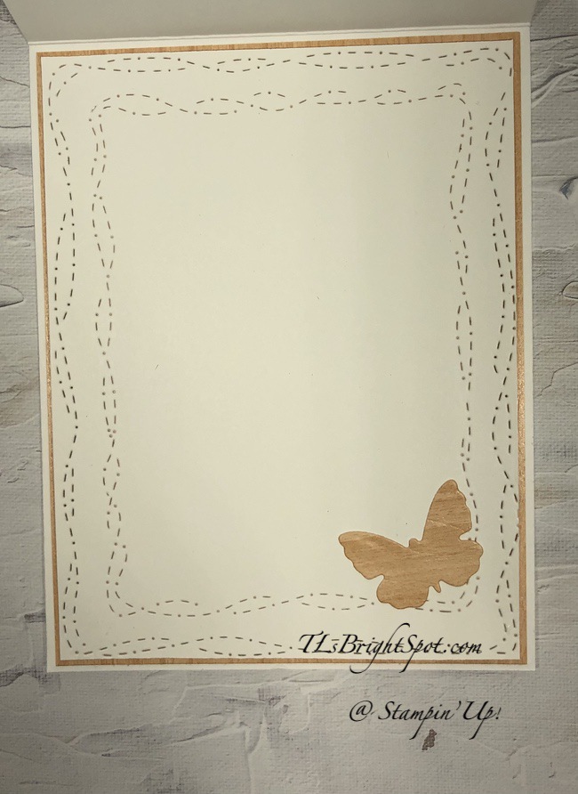 For the inside I used two Whimsy Dies to create this fun pattern on a Basic White panel – doesn’t it make it look as though the butterfly has flown everywhere? The butterfly also comes from the Meadow Dies and was adhered with liquid glue. Basic White panel to the Natural Touch Specialty Paper then into the inside of the card – done!