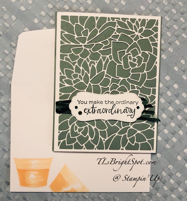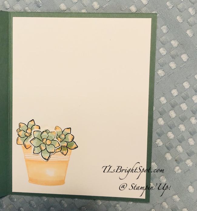 As I mentioned earlier, the card base uses one of the NEW IN COLORS, Soft Succulent – and it’s perfect! What a great shade of green, and I love how it pairs with some of the other greens SU! has in it’s lineup. The ‘top’ is a single die from the Potted Succulents Dies. Just so you know, you CAN cut this apart. I didn’t, as you see, but you can. The sentiment is one one of the banner dies in the set. And of course, I used a sentiment that works not only for our daughter, but is perfect with this die cut. Both are cut from Basic White card stock. The sentiment is stamped with Evening Evergreen ink – anothe4r NEW IN COLOR! And the folded-over ribbon is Open Weave Ribbon that comes in all five NEW IN COLORS. This happens to be Evening Evergreen. I also added some 21-23 In Color Jewels to the sentiment banner, which was adhered with dimensionals over the folded over ribbon. The ribbon is held in place with Seal+ on the back of the sentiment banner.