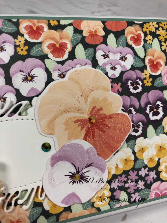 For card #2 you may notice the wonderful kind of pointy scallop under the DSP 🙂 That is from another new set called Basic Borders Dies. I die cut a panel from Basic White card stock for that and adhered it with liquid glue, then laid the 2020-2022 In color 6×6 DSP over that, adhering also with liquid glue. I die cut three pansies – 2 large and one smaller and coated them in Wink of Stella. I adhered the first pansy directly to the card, then another large one with dimensionals and adhered the smaller over that both with liquid glue and a dimensional. For these flower centers I added 2021-2023 In Color Jewels. Here’s a close-up and another picture of the card.