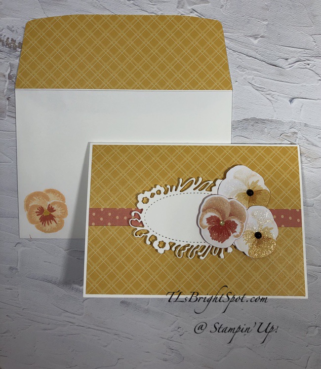 I find it interesting as I look at these that the cards are both in the landscape position. The size is 3 1/2 x 5, just perfect for a little hand written note. For both cards I used the 2020-2022 In Color 6×6 DSP for a foundation. For card #1 I covered most of the front then laid a 1/2″ strip across. These bring in the colors of the pansies and make that Calypso Coral pop. From Basic White I die cut a fancy oval using the Petals Labels Dies (retiring May 3) and added it to the front with dimensionals. The pansies are die cut from one of the Designer papers in the package – and I love that availability. I used my Wink of Stella to give them some glam, attached the two yellow pansies with liquid glue and the Calypso Coral pansy with dimensionals. For the centers I added Matte Black Dots to two of them and a single Gold Glitter Enamel Dot ~ and I called it done. I rather like the big open space of the white oval. For the envelope I actually stamped the pansy! Here’s a close-up of that.
