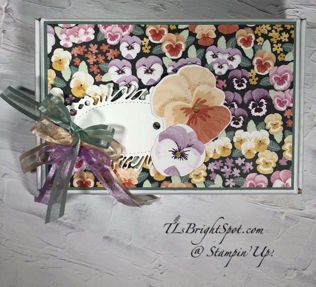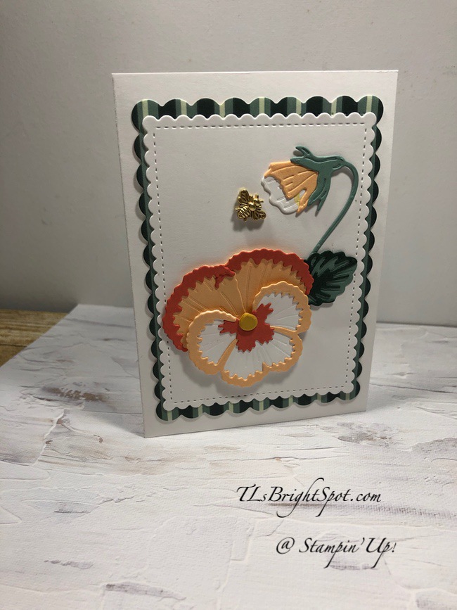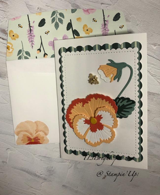 Hello again… it’s Pansy Patch time as we are completing the gift box for Mother’s Day š These cards have been a challenge for me – lots of parts and wanting to stamp and die cut, plus, learning the set. At any rate I’ve come up with two more notecards/ envelopes for our Mother’s Day Gift box using the Pansy Patch Bundle/ Suite.