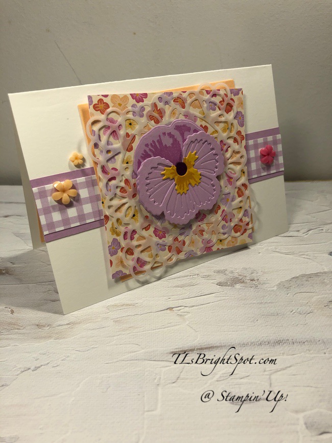 Yep, all new products on these cards! Let’s begin with the card on the left: two panels of square card stock (Pale Papaya & Pansy Petals DSP) layered, then a Vellum square doily on top of that. The doily just adds something – texture maybe, and a bit of a Victorian look. When I put these together I used Stampin’ Seal and just in the middle of the square. I rather like the looseness of the papers. Then I created the single pansy: Fresh Freesia card stock and ink, a bit of So Saffron card stock and ink and then Blackberry Bliss card stock for the very center. After putting all the parts together I added the pansy to the squares with dimensionals. Before adding the squares to the card I adhered two strips of card stock acrosss: Fresh Freesia and the Pansy Petals DSP – then adhered the squares with liquid glue. For a final touch I added these adorable Loose Flower Flourishes with liquid glue. Aren’t they sweet?