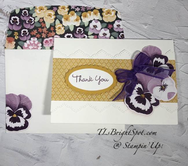 For the inside of this card… I stamped the sentiment from the Pansy Patch stamp set in Blackberry Bliss ink on a panel of Basic White card stock. After allowing this to dry for a bit I used my Blending Brush to gently add Fresh Freesia ink all over the panel, making it darker in the center. I added a Pale Papaya card stock panel behind this for a nice contrast and then into the inside of the card. Voila! For the envelope I stamped the pansy first in Fresh Freesia ink, then the filler in Blackberry Bliss ink , the small triangle definition in Gorgeous Grape ink and finally the center in Bumblebee ink. I added another panel of the gorgeous Pansy Petals DSP to the envelope flap and the card was done!