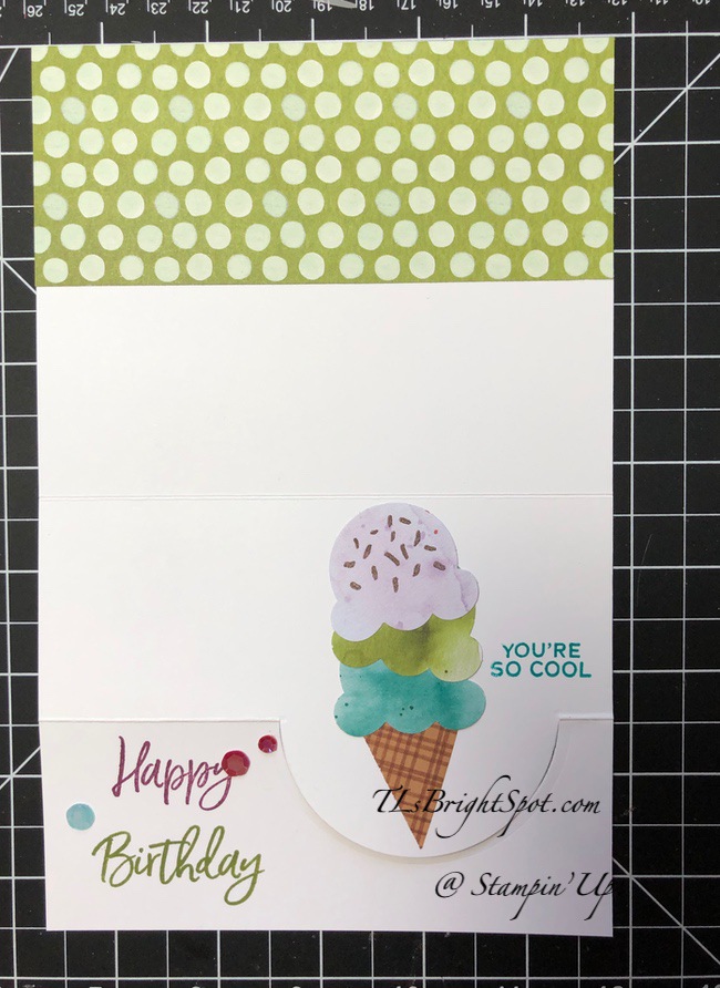 - The DSP is from the Ice Cream Corner DSP and can be found in the Jan-Jun Mini Catalog. It is cut 2 1/4 x 5 1/2 and adhered with liquid glue.