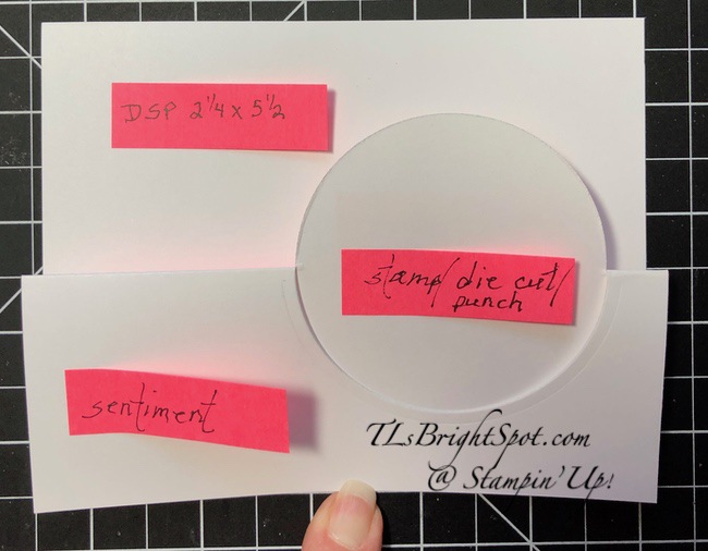 I began with a standard 5 1/2 x 8 1/2 Thick Basic White panel, scored at 4 1/4. I marked very lightly the 21/8 mark just where I wanted to die cut the circle. And of course, this doesn’t have to be a circle – it can be an oval or square or a diamond, but for this card, it’s a circle. With the marking I placed the Layering Circles die fairly close. to the right edge of the paper and placed it on the die cutting machine. In order to die cut just half the circle, place the top plate over the area to be die cut – and with the markings I knew just where that was. The neat part is, the machine will cut only where the top plate is 👍 Once removed from the machine, create the score line at 2 1/8, avoiding scoring the circle. Burnish the folds so they are mountain, valley – as shown. Now stamp and decorate!