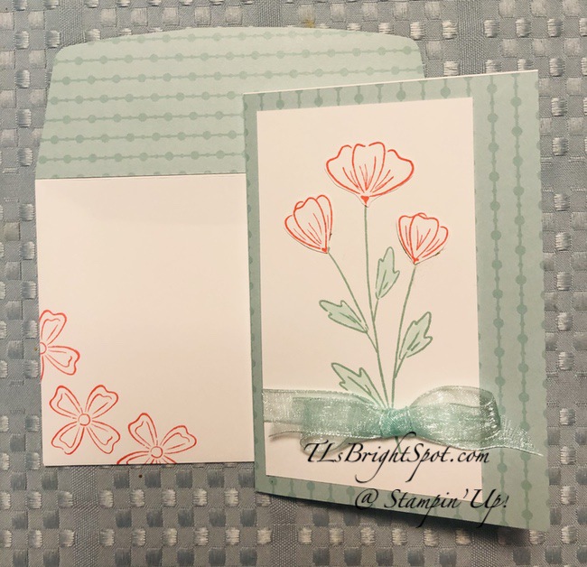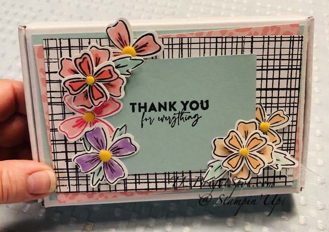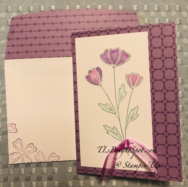 I used the very same 2020-2022 Subtles 6×6 DSP on the envelope flaps in Pool Party and in Highland Heather. I stamped the flower image from Flowers of Friendship in Polished Pink and in Fresh Freesia inks and the cards are done. Voila! They can be sent individually or put in the very cute Mini PP box I shared in yesterday’s post