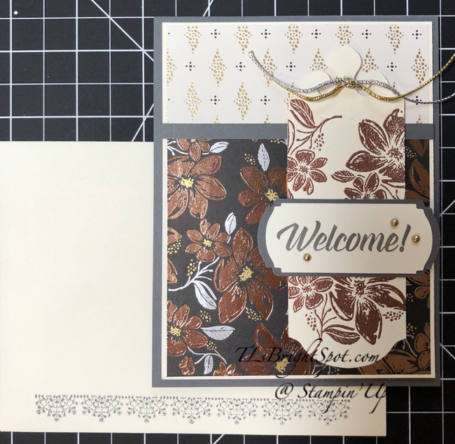 After creating the length I wanted, I stamped the flower image from the Elegantly Said stamp set in VersaMark, then into Copper Embossing Powder and heat set. I used both pieces (silver & gold) of the Simply Elegant Trim pack and tied a knot around the point of the tag. The tag got dimensionals and was added to the card front. Now we have two layers on dimensionals: the Very Vanilla w/ the DSP AND the tag.
