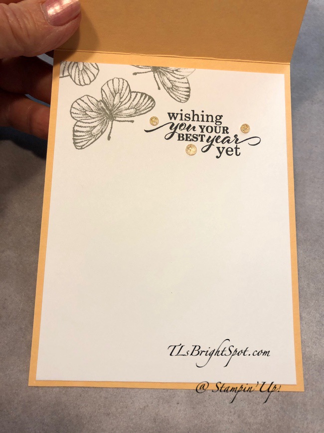 For the inside, I used a smaller butterfly from the same stamp set and stamped it in Smoky Slate, first generation. The sentiment is from the Best Year stamp set and is stamped in Memento Black ink. I added more Genial Gems around the sentiment. This basic White panel was adhered directly to the inside of the card with liquid glue and wow – done!