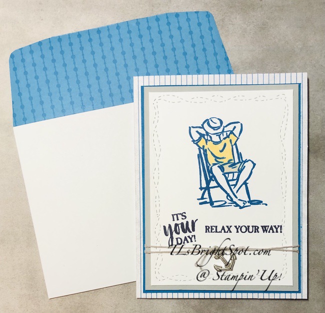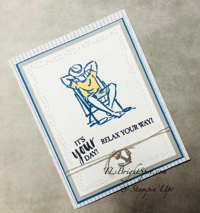I fist stamped the main image of the man in Pacific point ink on a Basic White panel, then colored him with Stampin’ Blends So Saffron and Crumb Cake. Next I ran this panel through using the Stitched Whimsy Dies to create a border. I then stamped the two sentiments from A Good Man in Night of Navy ink. Next step was to adhere this panel to a slightly larger piece of Smoky Slate card stock. I then wrapped Gray Granite Bakers Twine from the Essentials Pack twice around both layers and tied a knot. Because this man has worked for a local Yacht Club, I attached an anchor that is a retired item from a couple of years ago. Sorry… I shouldn’t do that, use retired items, but this card really did call for it! The anchor was secured with a couple of glue dots to keep it in place.
