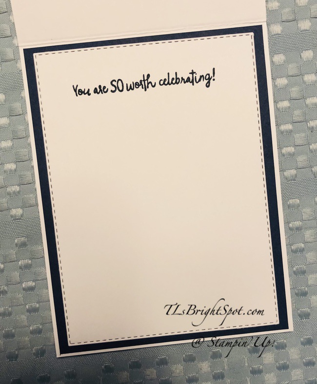 The inside was kept really simple – using the largest of the Stitched Rectangles dies, cut a panel of Basic White, stamp the sentiment from All Squared Away stamp set in Misty Moonlight ink and adhere with liquid glue to a larger Misty Moonlight panel, then attach to the inside of the card – yep, with liquid glue. And the card is complete… 🙂