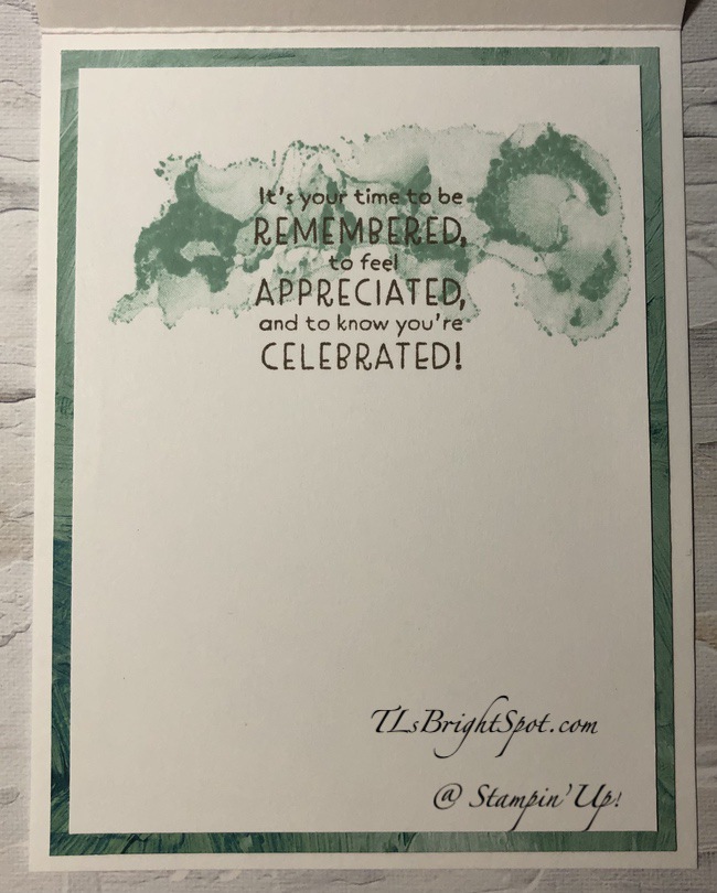 For the inside of the card I added another panel of the Fine Art Floral DSP. On the Basic White panel, I stamped this extra fun ‘blotch’ using the Artistically Ink stamp set with Pool Party ink. Over that I stamped the sentiment with Basic Gray ink from the Inspired Thoughts stamp set. I adhered the Basic White panel to the DSP and the card itself was complete.