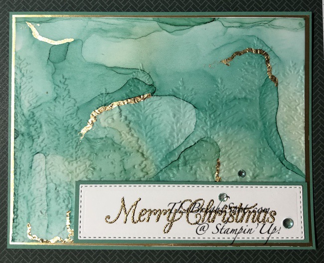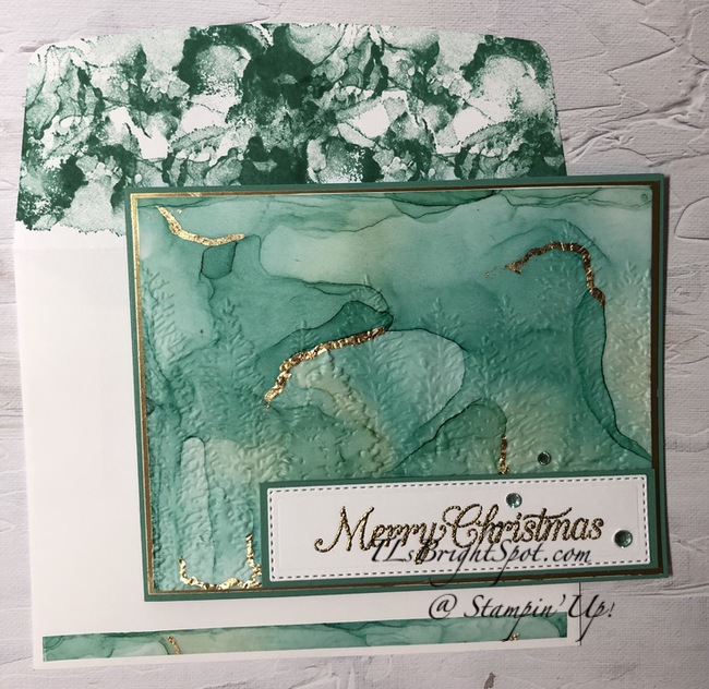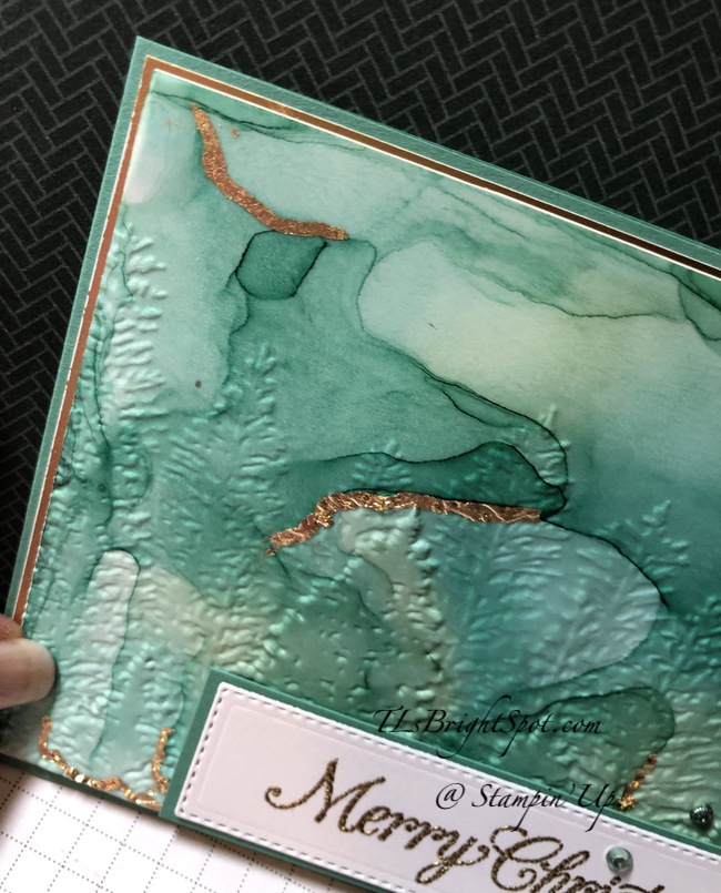 Can you see the use of the Evergreen Forest 3D Embossing Folder? I think the second photo shows it better. I was hoping it would show more, but it doesn’t so much. I love the look though. And the Gilded Leafing in a few places adds an elegant element and it kinda looks like lightning going through the trees. The front sentiment comes from the Poinsettia Petals stamp set, gold embossed & die cut with the Ornate Layers Dies then layered on a larger panel of Just Jade card stock.This sentiment banner was mounted on dimensionals and added to the card front. I added three Holiday Gems for a bit of glam πŸ™‚