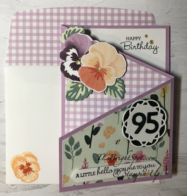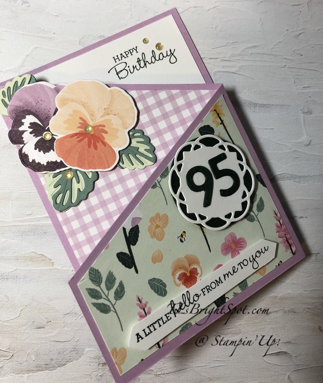 Hello stampers! Today’s card is a fun fold I have not done in – well, a long time. No reason really, just haven’t. I guess we could call it a Cascading Fun Fold and I’ve used the Pansy Patch bundle & Pansy Petals DSP to create this beauty.
