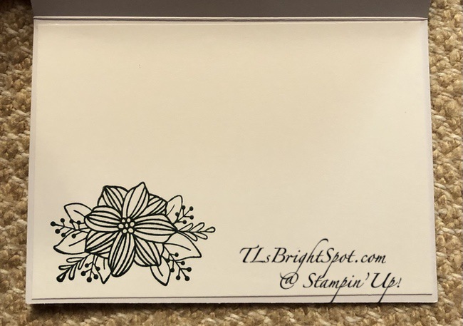 sweetFor the inside, stamp the sweet flower stamp included in the Paper Pumpkin kit with the Evening Evergreen ink spot – also in the kit, on a Basic White panel (3 3/8 x 4 7/8). Adhere to the inside of the notecard with liquid glue and this little notecard is complete.
