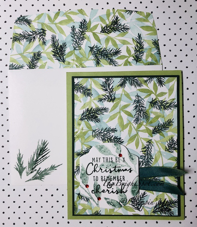 For the envelope I added more of the same beautiful DSP to the envelope flap, then stamped the pine stamp from Christmas Season stamp set in Evening Evergreen. And – done. A quick card that is just beautiful. These stamps and dies may be found on pages 16-17 of the Jul-Dec 2021 Mini Catalog.