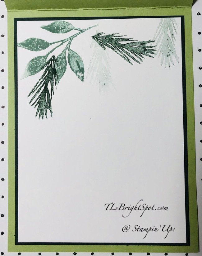 For the inside I used a couple of the stamps in the Christmas Season stamp set to create a beautiful ‘header’. I used Soft Succulent 2nd for the larger leaf. I then stamped the pine needles in Evening Evergreen ink 2nd & 3rd generation. Of course, these were stamped on Basic White card stock. I adhered this to a panel of Evening Evergreen, then into the inside of the card.