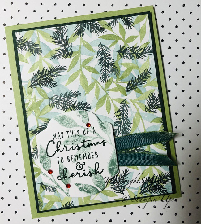 - Painted Christmas DSP adhered to Evening Evergreen card stock. Dimensionals on the back and adhered to the card base