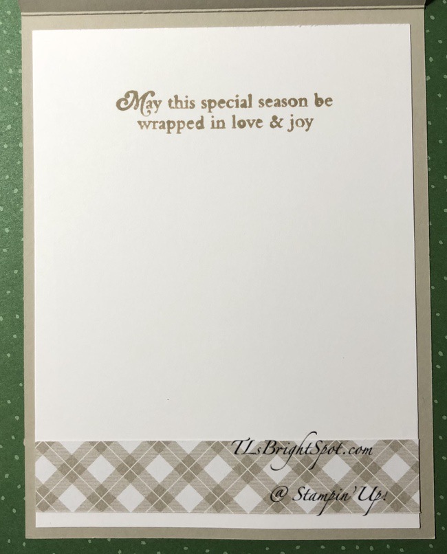 For the inside I stamped the sentiment in Sahara Sand ink using another stamp in the Perfectly Plaid stamp set. use my Stamparatus a lot too as I can re-stamp when necessary and align perfectly straight. I added more of the same Peaceful Prints DSP to the bottom of the Basic White panel and adhered it to the inside of the card. DONE!