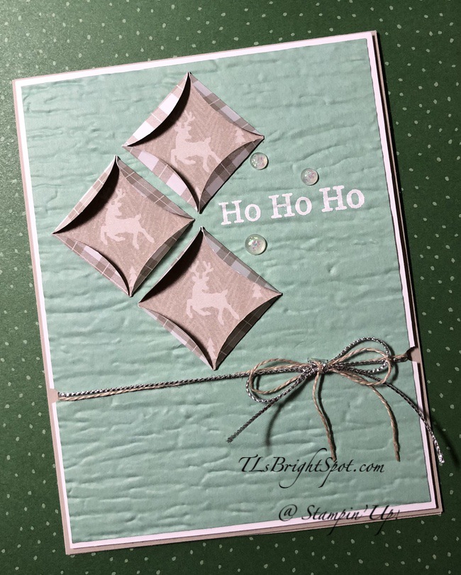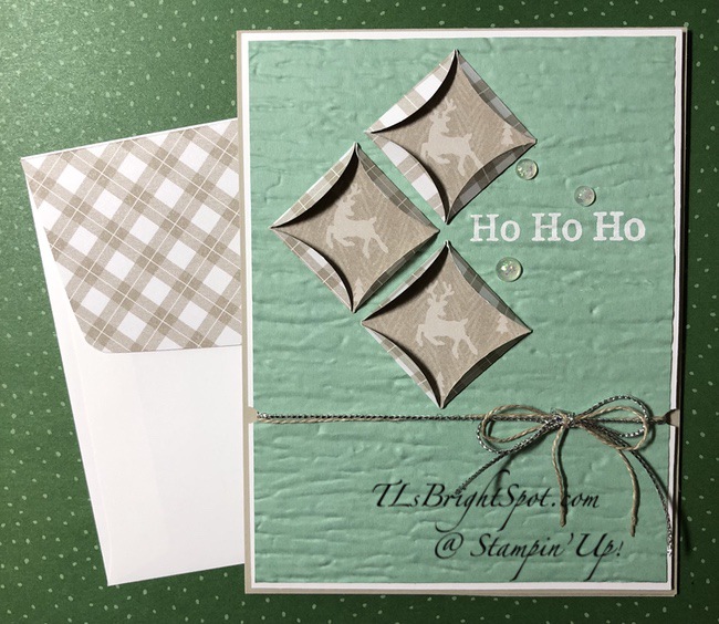 I placed but did not adhere the cathedral window pieces to determine where to stamp the sentiment. I stamped the sentiment from Perfectly Plaid stamp set in VersaMark ink, them embossed with white embossing powder & heat set it with my heat tool. Once that was cool & not tacky I then ran the Mint Macaron panel through the Bark 3D Embossing Folder. Boy am I glad I have this EF – I use it a LOT. The cathedral windows were adhered with liquid glue, then the Mint Macaron panel was adhered to a Basic White piece with liquid glue. I then punched the sides to create a place for the Linen Thread & Simply Elegant Trim in Silver to remain in place. These were wrapped around the two panels and tied in a bow. This entire panel was added to the Sahara Sand Card base with dimensionals. To complete the front I added three Opal Rounds.