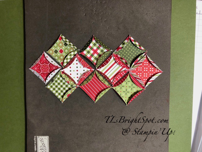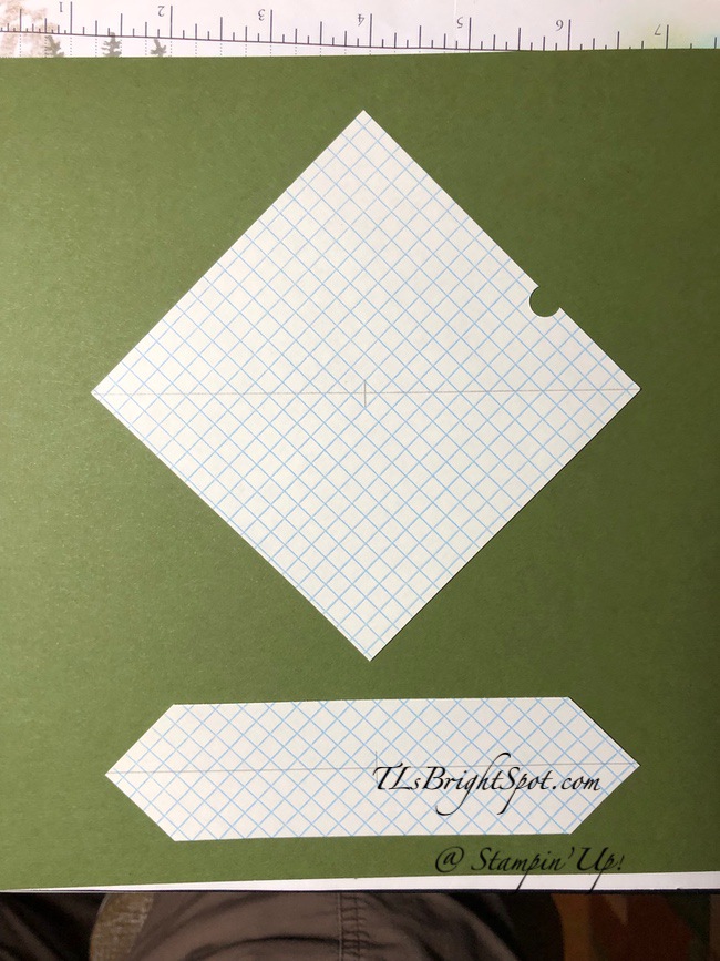 Using graph paper cut a 4″ square. Draw a line from opposite points, turn and mark center of that line. See photo! Placing the line from point to point on your paper trimmer at 3/4″ trim one side. Turn 180 degrees and do the same again. See photo for finished piece.