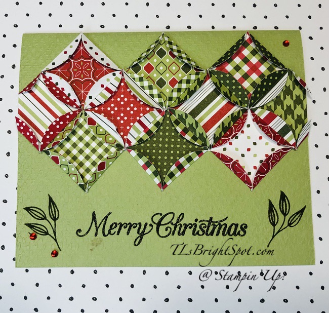 Turn the finished template to the back side and run Stampin’ Seal along the back, including the overlapping points of the windows; adhere in place. Add Red Rhinestone Basic Jewels randomly, but always in odd numbers. And voila~ your card front is complete!