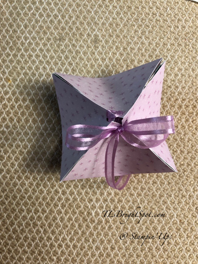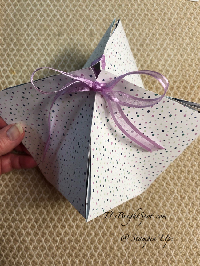 - After scoring, burnish all score lines. Mark the center of each edge and score from the center mark to the score line in an upside down V. Burnish those score lines as well. Punch holes in each corner about 1/2″ in from point. Thread ribbon through, first through opposite points, then each side point. Gently pull together and tie a bow. See photo…