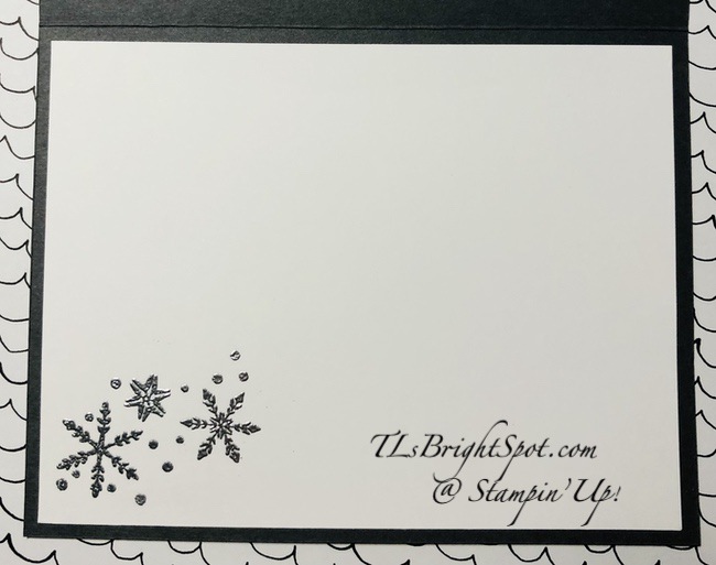For the inside, more snowflakes from Snowflake Wishes stamp set stamped n a Basic White panel with VersaMark ink, covered with Silver Embossing Powder and heat set. The snowflakes add a finishing touch to the inside – and I didn’t feel another sentiment was necessary, but it would be easy enough to do. Adhere panel to the inside of the card and that’s it!