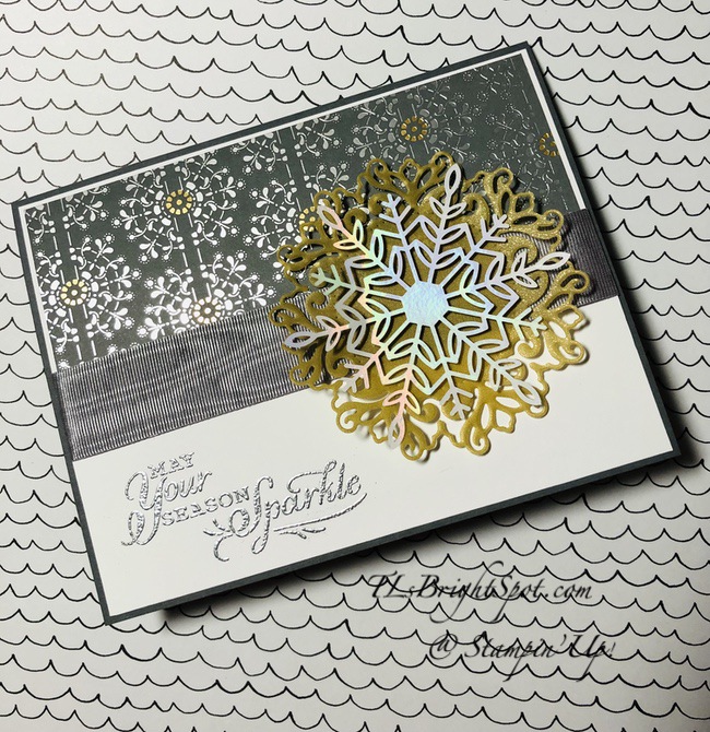 This is such an easy layout to ‘change up’. Besides the Simply Elegant DSP which is a major focus, there is also the Wonderful Snowflake and the background for it is a die cut from Gold Shimmer Vellum using one of the Encircled in Beauty Dies. Another addition is 7/8″ wide Textured Ribbon in Smoky Slate – lots of grays & golds going on here. The special touch is the Silver Embossing Powder for the sentiment. To me, that really brings it all together. The sentiment comes from Snowflake Wishes stamp set. Card cuts will be listed at the bottom of this post.