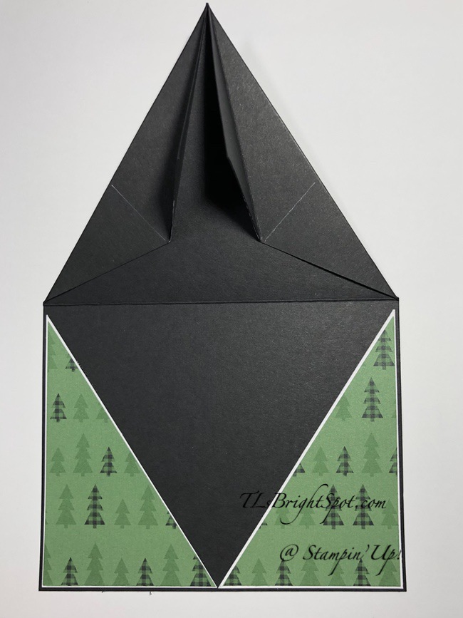 - Layer 1: Basic White 5 3/8 x 4 1/8,(cut 2) Mark center on the long side on both panels at 2 1/16″. CUT from right corner to center point. Do the same from the left corner to the point. Do this to both Basic White panels. I strongly encourage marking on the back side of the center triangle the top of the triangle for both triangular panels.